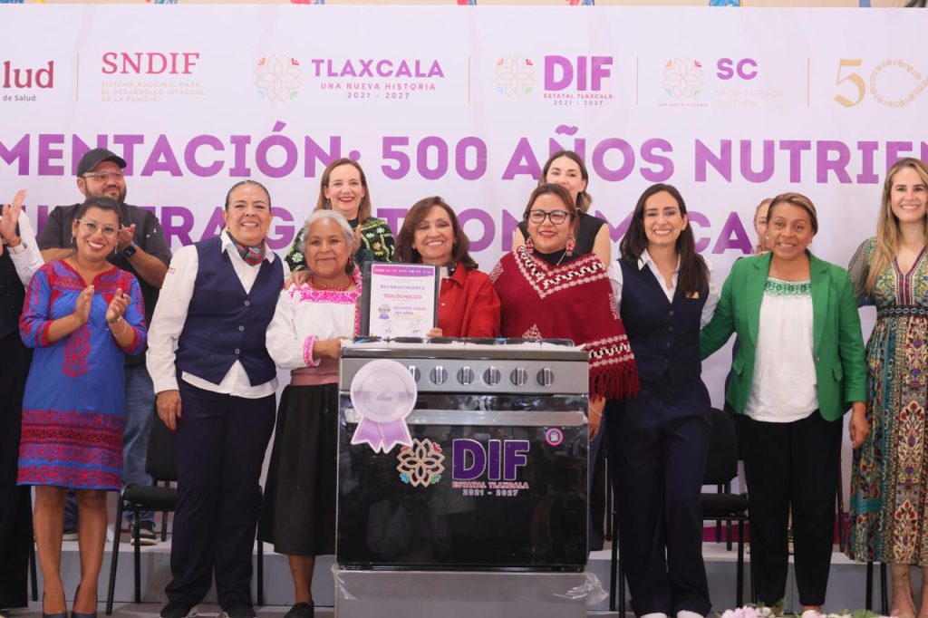La gobernadora, Lorena Cuéllar Cisneros; la presidenta honorífica del Sistema Estatal para el Desarrollo Integral de la Familia (Sedif), Mariana Espinosa de los Monteros Cuéllar, y la titular del Sistema Nacional DIF (Sndif), Rocío García Pérez, inauguraron la muestra gastronómica “500 años nutriendo con sabor”, en el marco de la conmemoración del Día Mundial de la Alimentación 2025 y de la celebración por los 500 años de la Fundación de la Ciudad de Tlaxcala.