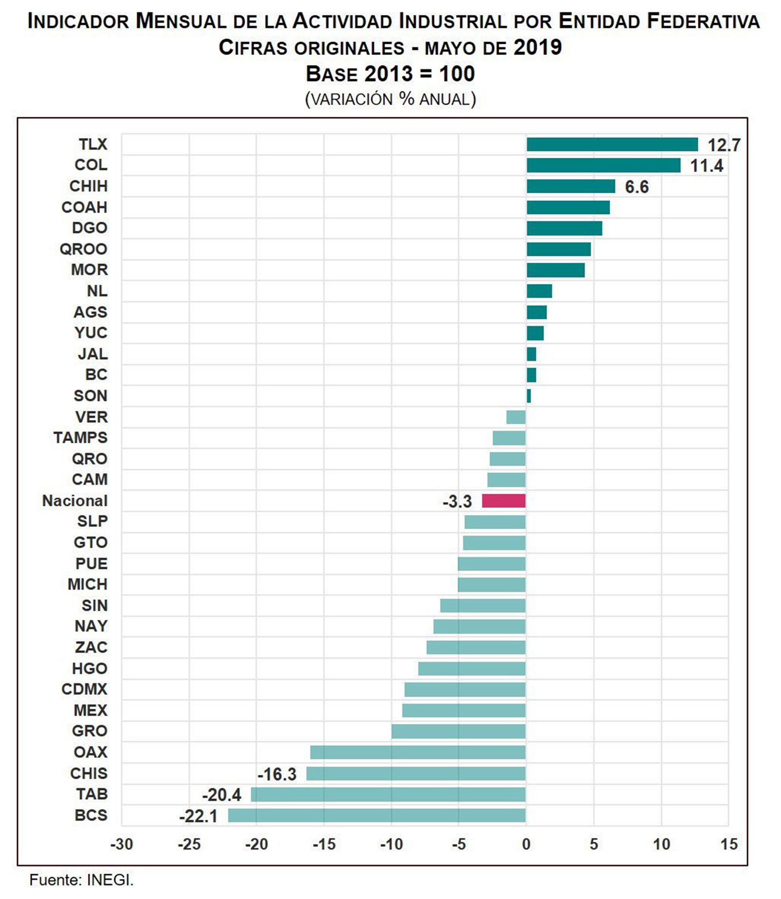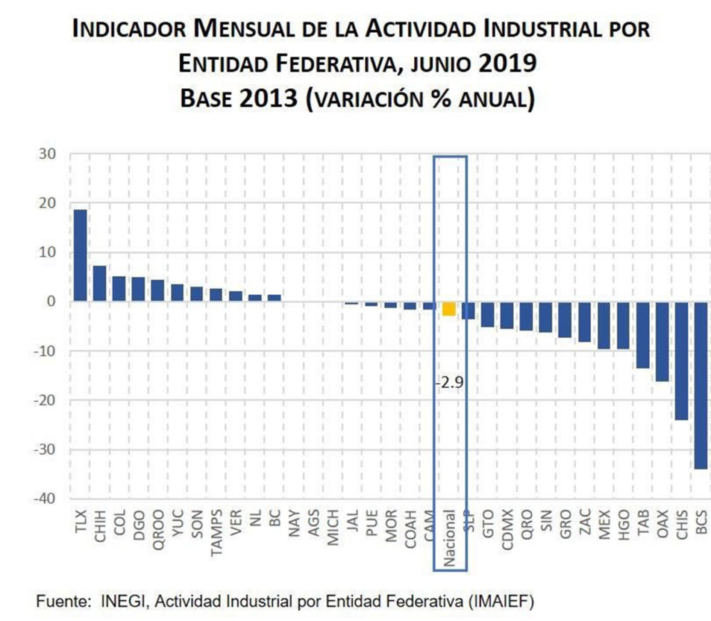 De acuerdo con el documento, Tlaxcala logró en junio de 2019 un mayor crecimiento anual en sus actividades industriales secundarias seguido por entidades como Chihuahua y Colima.