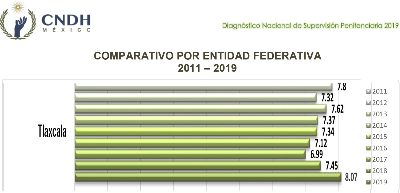 Tlaxcala,Tlax.-Con una calificación de 8.07 y una tendencia al alza, Tlaxcala a través de la Dirección de Prevención y Reinserción Social de la Secretaría de Seguridad Ciudadana (SSC) obtuvo el segundo lugar en el Diagnóstico Nacional de Supervisión Penitenciaria (DNSP) 2019, que realiza la Comisión Nacional de los Derechos Humanos (CNDH).