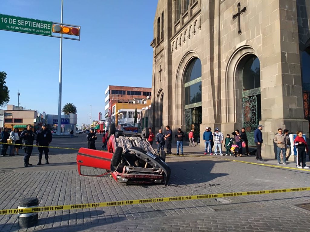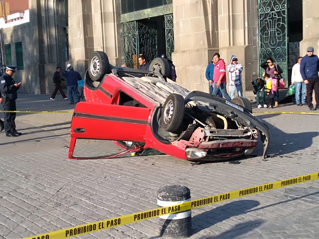 Fue en la esquina del Boulevard 16 de Septiembre y Avenida Cuauhtémoc, que el auto Chevrolet tipo Chevy de color rojo y placas particulares terminación 47-24 del Estado de Puebla, el que con posible exceso de velocidad al frenar abruptamente por el cambio de luz del semáforo, perdió el control colisionando con un bolardo y volcar aparatósamente, hasta quedar “llantas arriba” a un costado de la Basílica de la Misericordia.